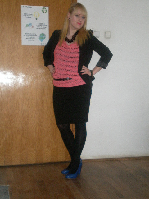 Stradivarius skirt, blouse & jacket ; Zara shoes; Gatta tights; Meli-Melo necklace; no name bracelet